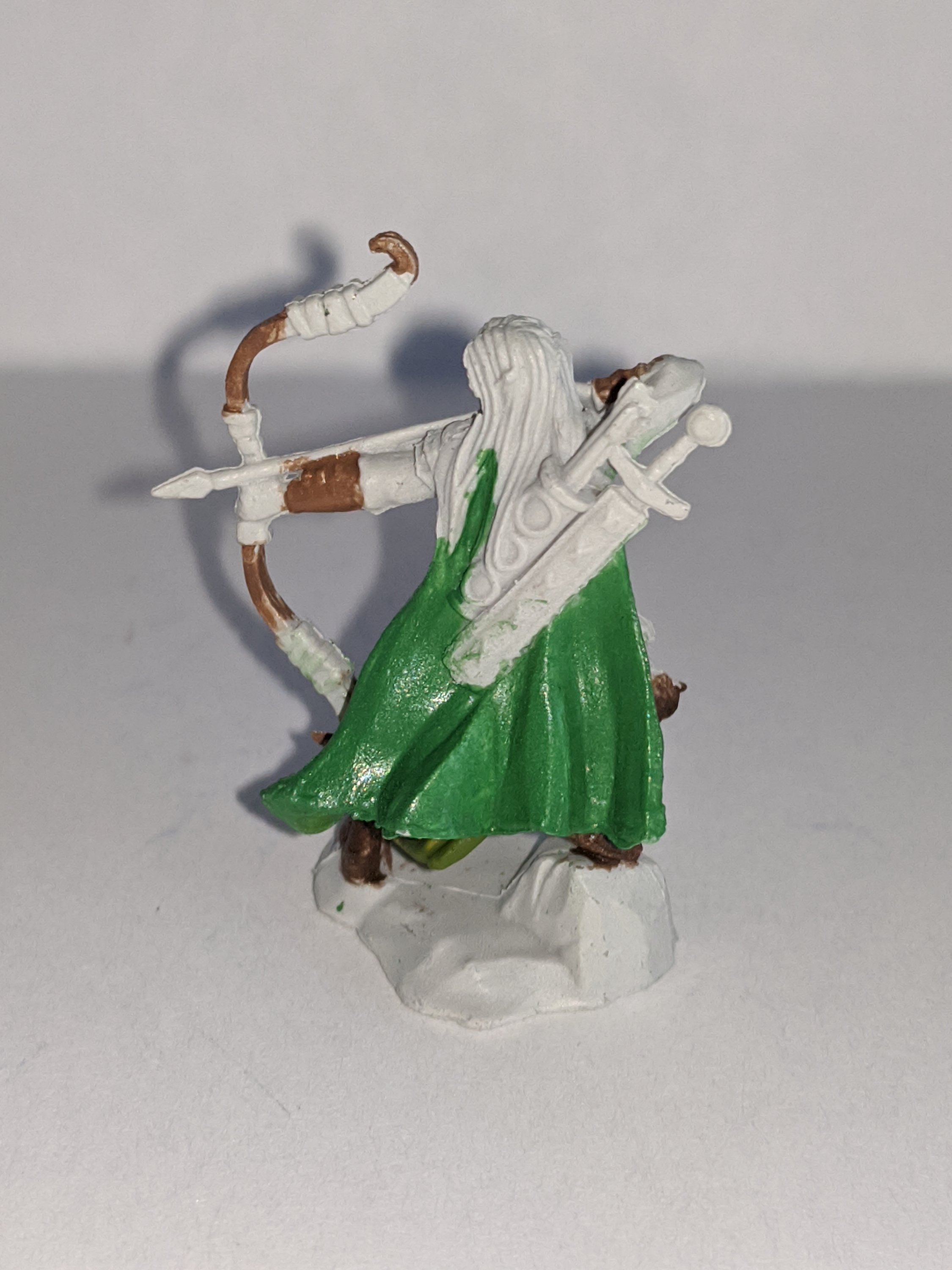 So I promised an update on the painting of the female elven ranger miniature that one of our Dear Readers had won in our first giveaway, and here is where she was last…
